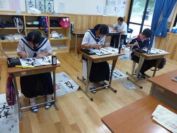 国語の授業で書写をしました。中1は「大洋」、中2は「流れる雲」、中3は「栄光のかけ橋」をいずれも行書で書きました。中学部職員も生徒にまざって一緒に書写の練習をしました。みんなものすごい集中力で取り組み、書けば書くほどいい作品になっていきました。文化発表会で展示しますので、是非ご覧になってください。