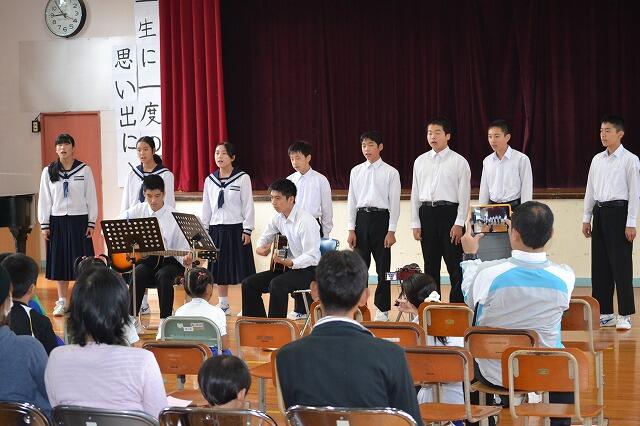 手前の平屋が中学部校舎です。奥が元々の小学校の校舎で、1階の職員室、保健室、3階の音楽室、図書室、家庭科室、理科室は兼用です。校庭は狭くなりましたが、昼休みは小中学生とも元気よく遊んでいます。交流をしていただける学校がありましたら、ご連絡ください。
