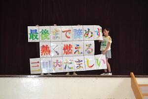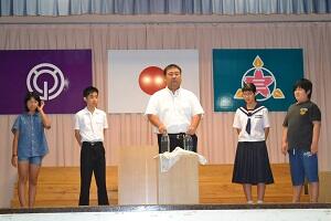 終業式では、児童・生徒代表が、1学期頑張ったことやこれからの目標などについて発表しました。また、校長先生から「夢をもつこと」とその夢に向かって「挑戦をし続けること」の大切さや、身の回りには危険がたくさんあるので、気を付けて生活することなどについて等の話がありました。