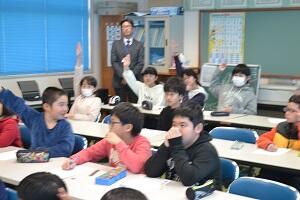 21日(水)にふるさと教育推進事業の一環として、ケーブルメディアワイワイから高森様に講話をしていただきました。入社の動機や仕事のやりがい・苦労について話してくださいました。「桃」と「腿」など同じ読み方の発音の違いやニュース原稿を実際に読んだりするなどの活動もあり、小学6年生と中学生は、よく考え、練習していました。最後に「夢」をもつことの大事さを教えてくださいました。お忙しい中、ありがとうございました。