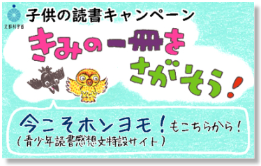 今回は、先日紹介しました文部科学省の「子どもの学び応援サイト」の中に、「子供の読書キャンペーン~きみの一冊をさがそう~」のコーナーがアップされたので紹介します。