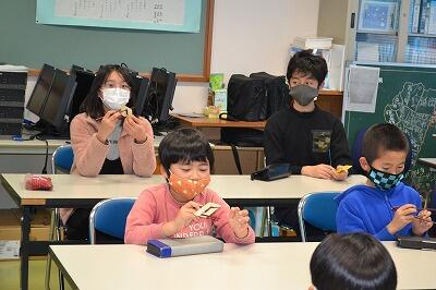 手前の平屋が中学部校舎です。奥が元々の小学校の校舎で、1階の職員室、保健室、3階の音楽室、図書室、家庭科室、理科室は兼用です。校庭は狭くなりましたが、昼休みは小中学生とも元気よく遊んでいます。交流をしていただける学校がありましたら、ご連絡ください。