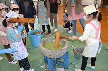 1月20日 もちつき大会を行いました。6月の田植え、10月の稲刈りを体験し、今回は、昔ながらの石臼と杵を使いもちをつきました。3年ぶりの開催となり、今回初めてもちつきをする児童も多く、保護者や地域の方の指導を受けながら全員で行いました。