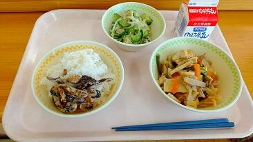 4月22日 麦ごはん 牛乳 いわし甘露煮 おかか和え 豚汁
