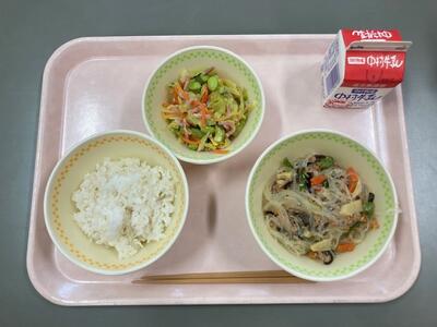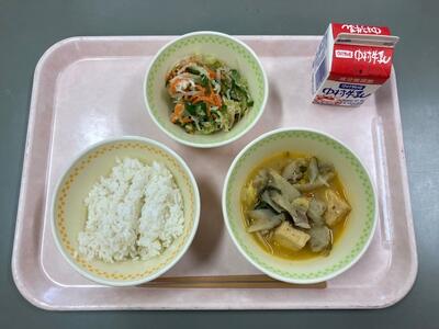 麦ごはん、豚肉とたけのこの炒め煮、きゅうりの中華和え、かりかりなばちゃん、牛乳