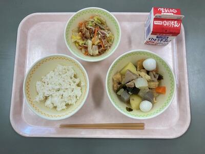 麦ごはん、団子汁、千切り大根の卵とじ、牛乳