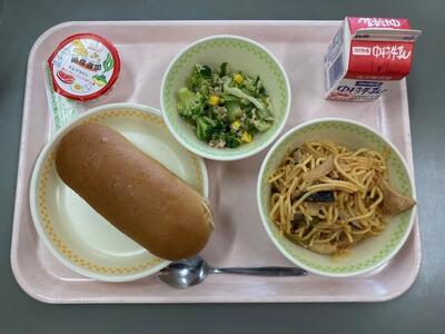 減量わかめごはん、焼きそば、フルーツヨーグルト、牛乳