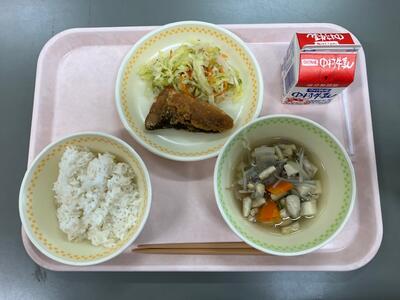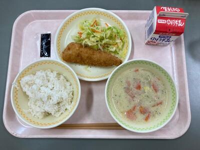 5月23日 チーズパン 牛乳 メンチカツ 野菜のレモン和え 野菜スープ