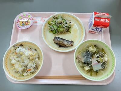 きのこごはん、根菜ごま汁、煮魚・こんにゃく、牛乳