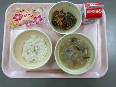 3月21日 麦ごはん 牛乳 たこ焼き風 春雨スープ お祝いクレープ
