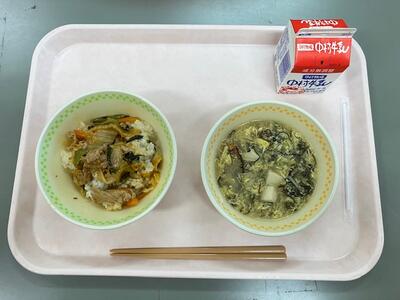 4月8日 豚キムチ丼 牛乳 もずくスープ