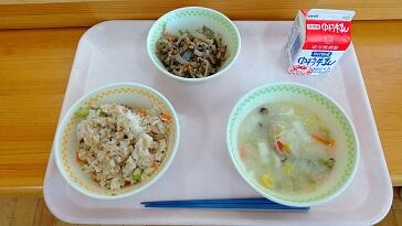 きのこごはん、根菜ごま汁、煮魚・こんにゃく、牛乳