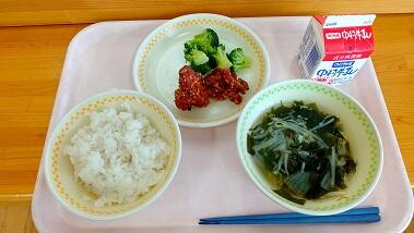 麦ごはん、わかめスープ、ヤンニョムチキン、ブロッコリー、牛乳