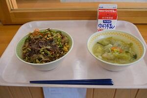 高千穂ぎゅっと丼・牛乳・高千穂野菜スープ