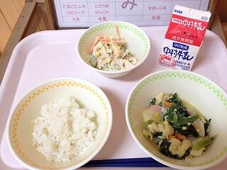 今日は「高野豆腐の卵とじ」でした。このような豆を主に使った料理は週に1回出します。植物性たんぱく質をとってほしいからです。給食ではいろいろな豆料理が登場しますよ