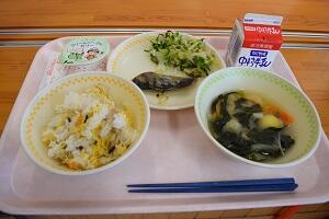 麦ごはん、すまし汁、魚のしょうがみそかけ、魚の昆布和え、牛乳