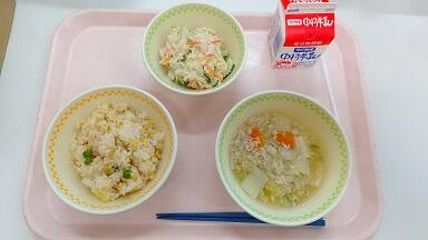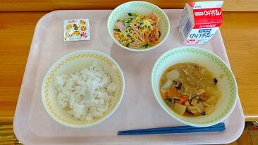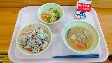 三色ごはん、里芋のすり流し汁、おからサラダ、牛乳