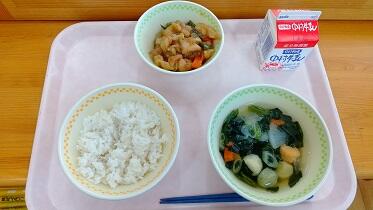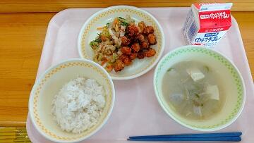 麦ごはん、野菜つみれ汁、鶏肉と生椎茸の揚げ煮、牛乳