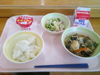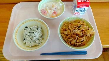 減量わかめごはん、焼きそば、フルーツヨーグルト、牛乳