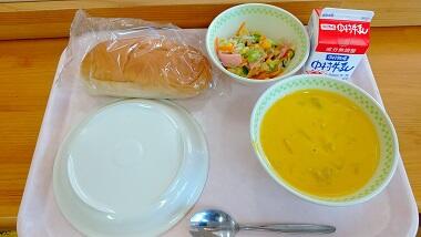チーズパン、パンプキンシチュー、コールスローサラダ、牛乳