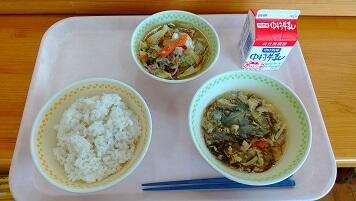 麦ごはん、もずくスープ、ごまだれ焼き肉、牛乳