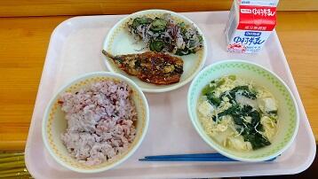 十二穀米、かきたま汁、いわしの蒲焼き風、ゆかり和え、牛乳