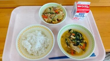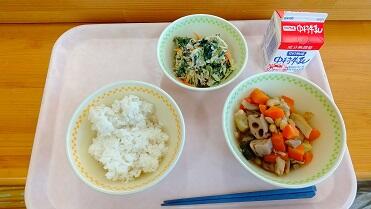 麦ごはん、鶏肉と大豆の煮物、いそマヨネーズあえ、牛乳