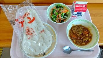 ナン、根菜カレー、ブロッコリーサラダ、牛乳