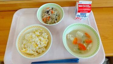 とうきびごはん、魚のみそ汁、千切り大根の炒め煮、牛乳
