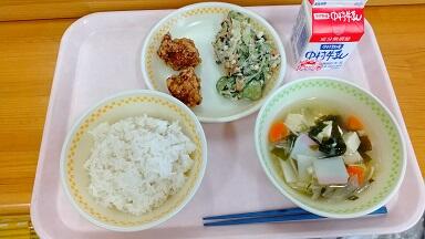 麦ごはん、豆腐のすまし汁、鶏肉の唐揚げ、納豆サラダ、牛乳