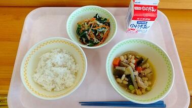 麦ごはん、五目豆、ほうれん草の和え者、牛乳