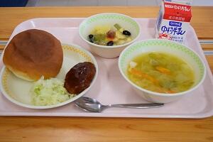 ハンバーガー、野菜スープ、フルーツみつまめ、牛乳
