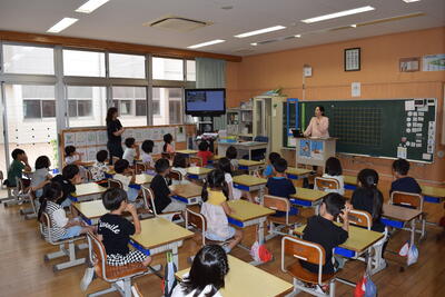 今回は、国際理解教育の視点から、1・2年生を対象にアメリカのようすについてお話をしていただきました。