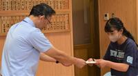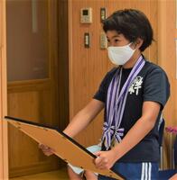 高千穂町防犯協会から1年生の子どもたちに「いかのおすし」防犯グッズが送られました。1年生47名を代表して、2名の児童がもらいました。「いかのおすし」を守って、安全な生活が送れるようになるといいです。