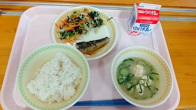 麦ごはん、冷や汁、いわしの生姜煮、小松菜のお浸し、牛乳
