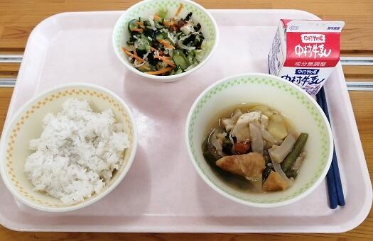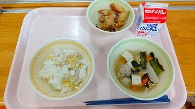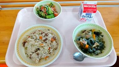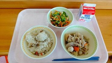 とりめし、豚肉とれんこんの炒め煮、まめまめサラダ、牛乳