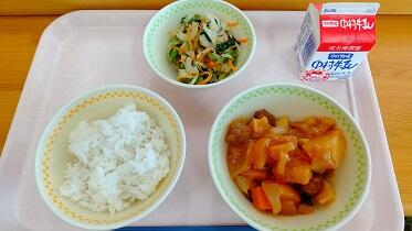 麦ごはん、肉団子の甘酢あん、野菜のごま和え、牛乳