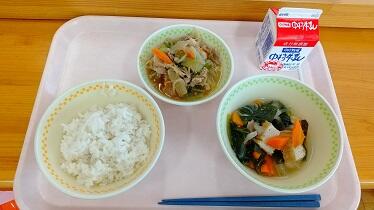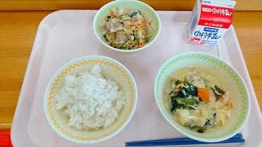 麦ごはん、かきたま汁、豚肉のごまみそマヨネーズ、牛乳