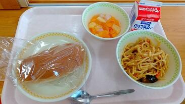 黒糖パン、なすとひき肉のスパゲティ、フルーツジュレ、牛乳