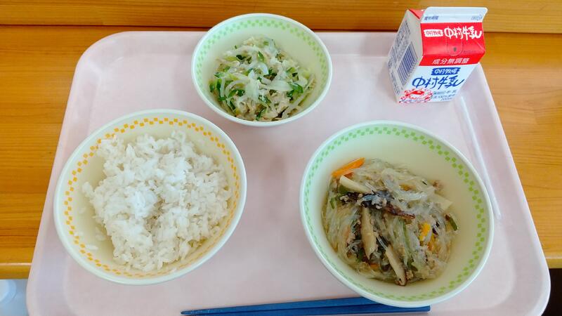 減量ゆかりごはん、炒めビーフン、フルーツ杏仁、牛乳