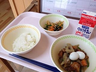 今日は「高野豆腐の卵とじ」でした。このような豆を主に使った料理は週に1回出します。植物性たんぱく質をとってほしいからです。給食ではいろいろな豆料理が登場しますよ