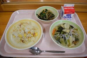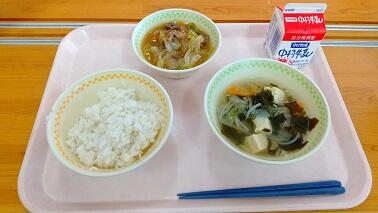 麦ごはん、わかめスープ、焼き肉、牛乳