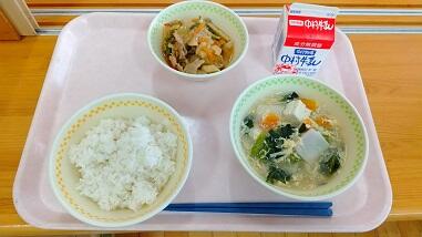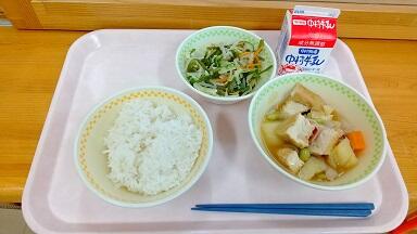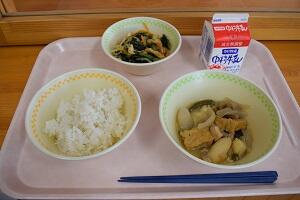 麦ごはん、鶏肉と里芋の味噌煮、小松菜のごまあえ、牛乳
