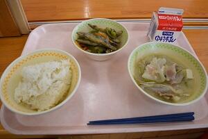 麦ごはん、豚汁、きびなごの南蛮漬け、牛乳