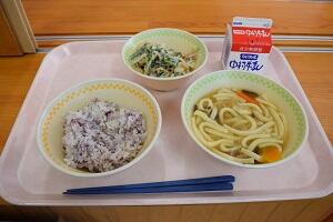 減量しそごはん、肉うどん、いそマヨネーズあえ、牛乳