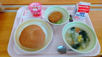 コロッケバーガー(肉じゃがコロッケ、キャベツ)、野菜スープ、牛乳