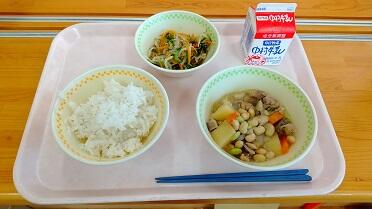 麦ごはん、鶏肉と大豆の煮物、昆布の酢の物、牛乳