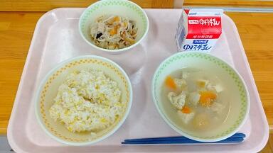 とうきびごはん、魚のみそ汁、千切り大根の炒め煮、牛乳