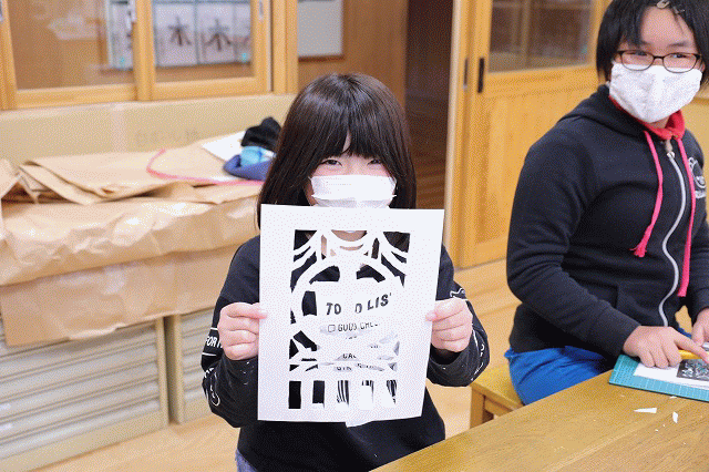 子供たちは、自分の好きなデザインを選んでカッターで切っていきました。日頃使い慣れていない子はなかなか上手に切れなくて四苦八苦していました。講師としてこられた保存会の方に手伝ってもらって完成させていました。