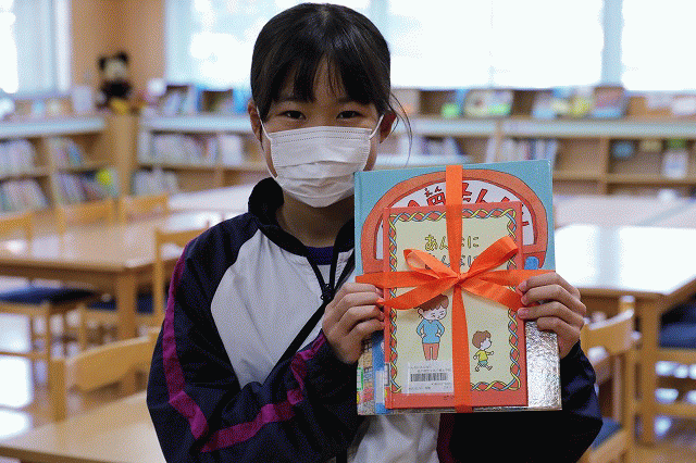 本のもりで図書委員会の児童に木田建設の田崎様から本の寄贈があり、図書委員会の児童一人一人がお礼の言葉を述べました。その後、図書委員会の児童からの感謝の手紙をお渡ししました。